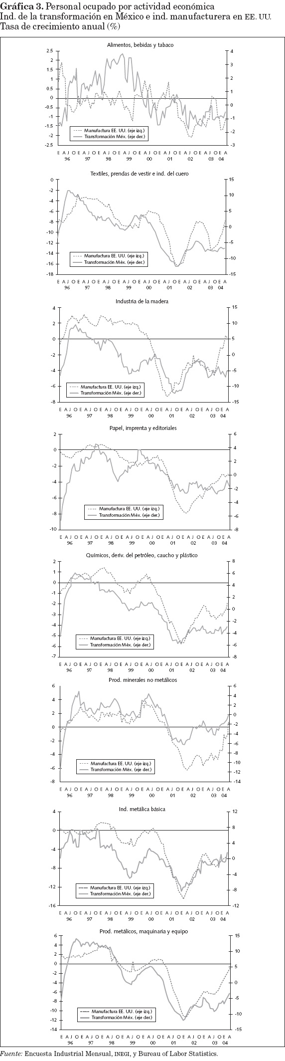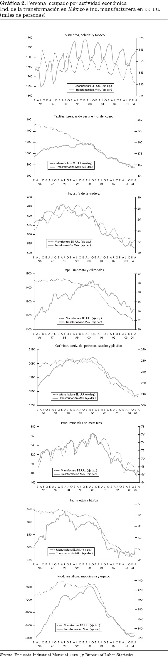Si bien la industria manufacturera en Estados Unidos ocupa 11 veces más empleados que la de México, cabe destacar que en ambas la pérdida de empleos durante la desaceleración económica se registró a tasas similares (gráfica 1). No obstante, la recuperación observada a partir de 2002 es más evidente en los Estados Unidos.