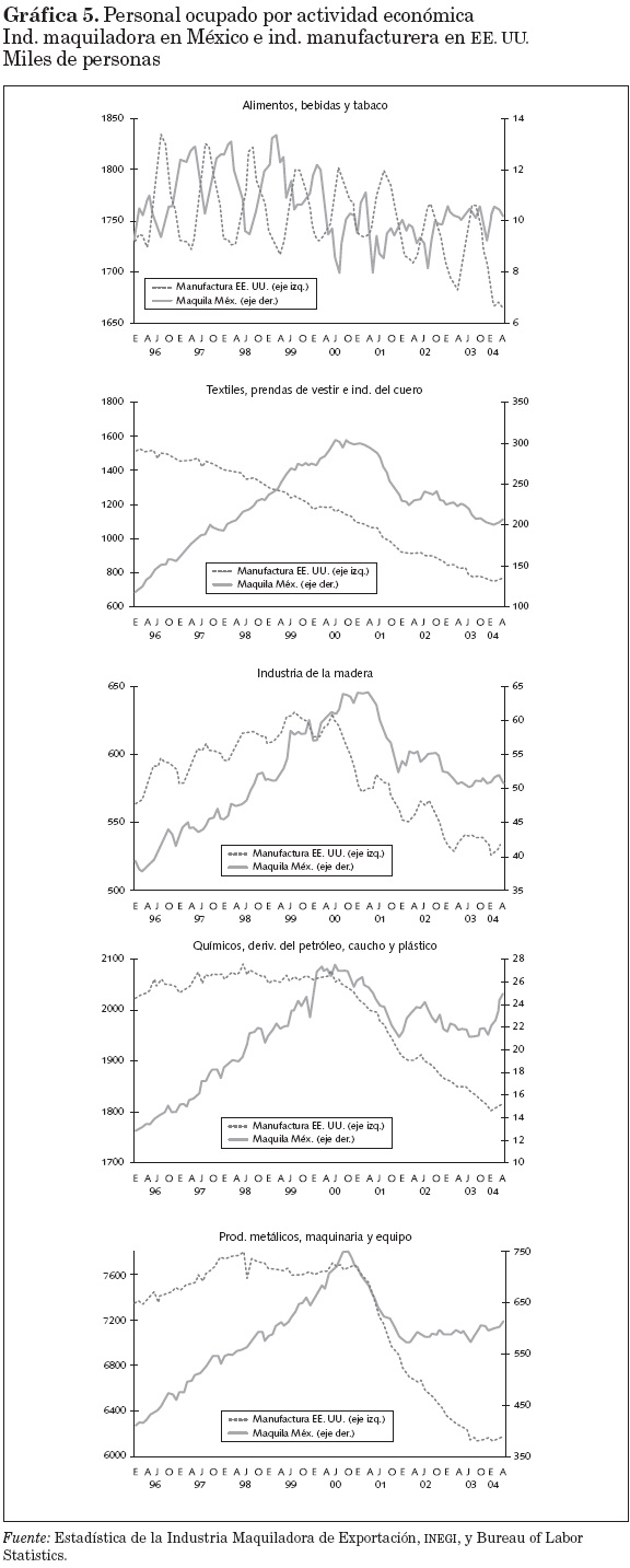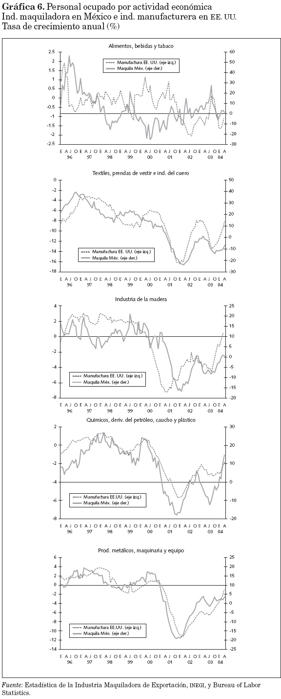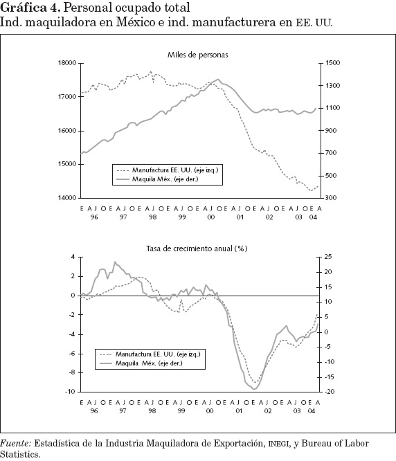 En la gráfica 4 se ilustra el comportamiento del empleo en este sector. Destacamos que en la industria maquiladora la desaceleración del empleo fue más pronunciada durante el año 2001; sin embargo, también se observa cierta recuperación con mayor antelación que en la industria de la transformación. A su vez, esta evolución parece seguir más de cerca la observada en la industria de la transformación de Estados Unidos.
