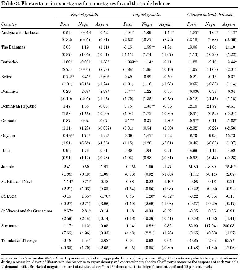 The results of estimating the empirical model of real output growth are presented in table 2 across the sample of Caribbean countries under investigation. The discussion below will focus on asymmetry in the effects of aggregate demand shocks on real output growth during cyclical upturns and downturns. Evidence of this asymmetry will determine the net effect of demand variability on trend real output growth.