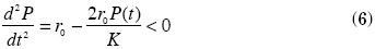 que es precisamente la solución particular a (1) con P(0) = P0. Los límites al crecimiento de (2) están fijados en la gráfica 3 por