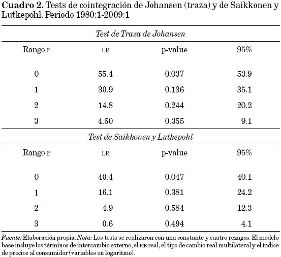 En el cuadro 2 se presentan los tests de traza de Johansen y el de Saikkonen y Lutkepohl en un modelo que incluye los términos de intercambio externo, el PIBreal, el tipo de cambio real multilateral y los precios internos al consumidor con una constante y cuatro rezagos. El correspondiente rango de cointegración representa el valor para el cual la hipótesis nula (existencia de cointegración) no puede rechazarse por primera vez (al 95%). En este caso se observa un vector de cointegración entre las variables para ambos tests.13