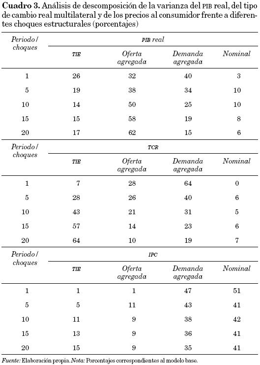En el cuadro 3 se indican los porcentajes de la varianza del PIBreal, del tipo de cambio real multilateral y de los precios al consumidor explicados por los choques en los términos de intercambio externo y por los choques internos.