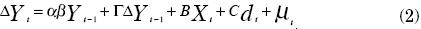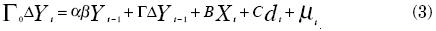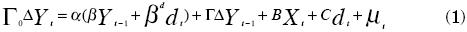 donde Yt indica el vector de variables endógenas, dt el de las variables determinísticas y Xt de las exógenas (β representa las relaciones de cointegración, α el parámetro de ajuste, C y B, Γ,βd representan matrices de coeficientes, y μt el término de error):