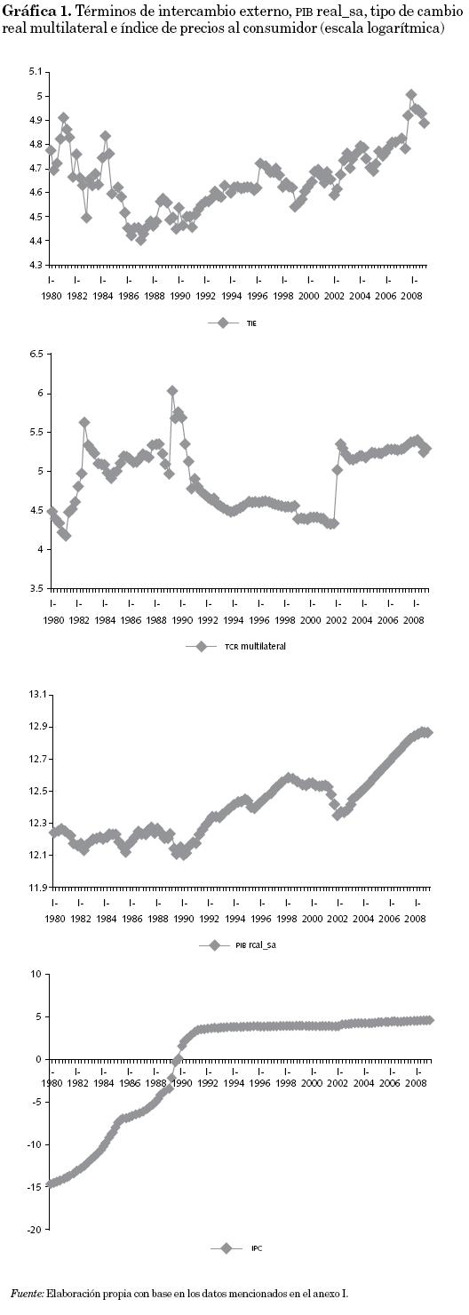 En la gráfica 1 se muestran las series utilizadas en las estimaciones (modelo base): términos de intercambio externo, PIBreal desestacionalizado, tipo de cambio real multilateral e índice de precios al consumidor, en escala logarítmica. Los comportamientos de estas variables reflejan la volatilidad observada durante el periodo, así como las marchas y contramarchas (stop and go) sufridas por la economía argentina en las últimas tres décadas.