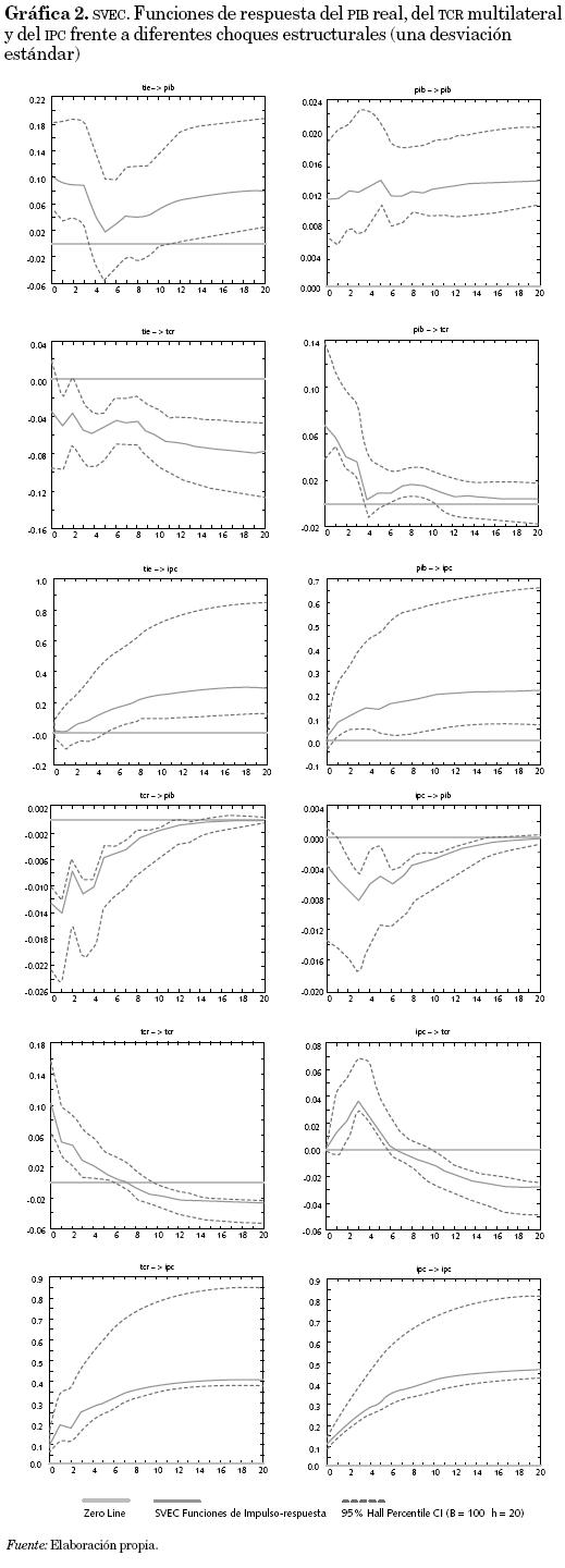 Cabe agregar que las restricciones impuestas al modelo SVEC permiten que los choques de oferta afecten el tipo de cambio real en el largo plazo, y que los choques de demanda afecten el nivel de precios también en el largo plazo. (De esta manera, los resultados de las funciones de impulso-respuesta no estarían contradiciendo las restricciones impuestas al modelo.)