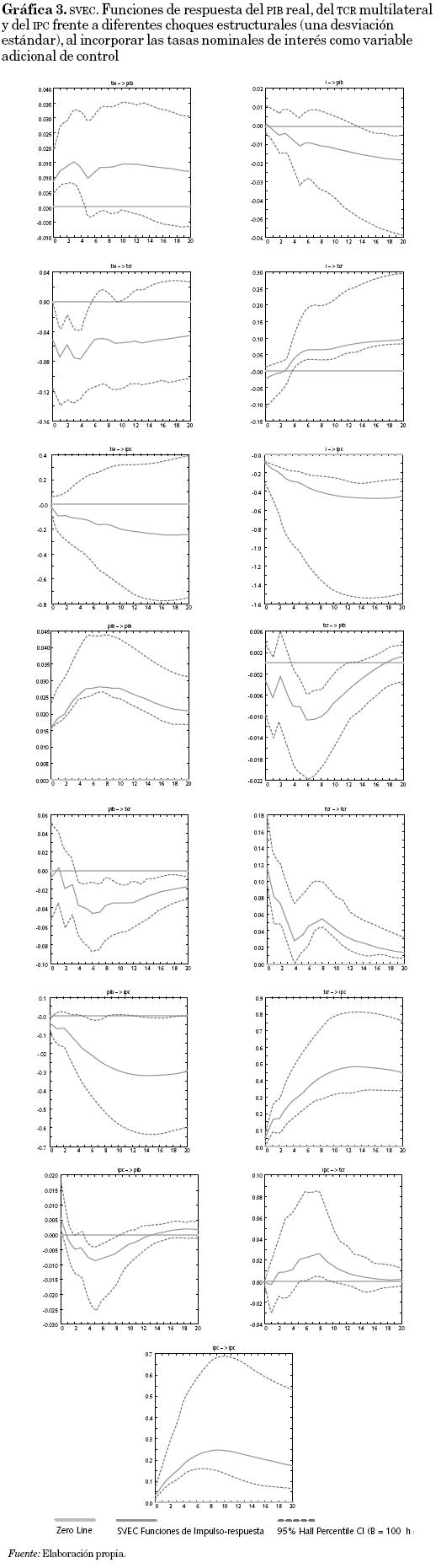 El análisis de descomposición de la varianza (la contribución relativa de los diferentes choques) muestra que las fluctuaciones en el producto real obedecen principalmente a los choques de oferta agregada (62 por ciento después de veinte trimestres) y en menor medida a los de precios reales externos (17%). Por su parte, estos últimos choques explican alrededor de un 64 por ciento de las fluctuaciones en el tipo de cambio real multilateral después de veinte trimestres y los de demanda agregada alrededor de 19 por ciento, mientras que la varianza del nivel de precios responde en primer lugar a los choques nominales (41 por ciento después de veinte trimestres) seguidos por los de demanda agregada (35%). Al incluir las tasas nominales de interés como variable de control, se observa que los choques en los términos de intercambio externo explican un porcentaje similar de la varianza del producto real en el largo plazo (18%) y algo menor de la del tipo de cambio real multilateral (28%) que en el caso del modelo base, mientras que las tasas nominales de interés representan 15 por ciento de la variabilidad del producto real después de veinte trimestres. En esta forma, la introducción de las tasas de interés como variable de control muestra que los choques en los términos de intercambio externo resultan más importantes que los de la variable monetaria para explicar la volatilidad del producto en el largo plazo (algunos trabajos han encontrado también que los choques de precios externos serían más importantes que las políticas monetarias restrictivas para explicar los niveles de actividad económica: Hoover y Pérez, 1994; Davis y Haltiwanger, 2001; Hamilton y Herrera, 2004).