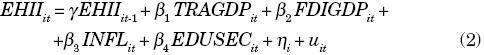 Where EHII is the estimated household income inequality indicator, TRAGDP is the rate of trade to GDP, FDIGDP is the inflow of FDI as a percentage of GDP, INFL shows the annual percentage change of consumer prices, and EDUSEC represents the gross secondary school enrollment as outlined earlier. Subscripts i and t indicate country and year respectively; the error term uit is assumed to satisfy white noise assumptions; αi lets the intercept vary for each country and captures country-specific differences; finally, β1 to β4 are parameters to be estimated. Previous studies dealing with the effect of market openness on income inequality have applied similar specifications; for instance, IMF (2007) incorporates trade volume and the FDI to GDP ratio as proxies of market openness; in addition, the study includes variables on education, such as population share with at least secondary education and average years of schooling.