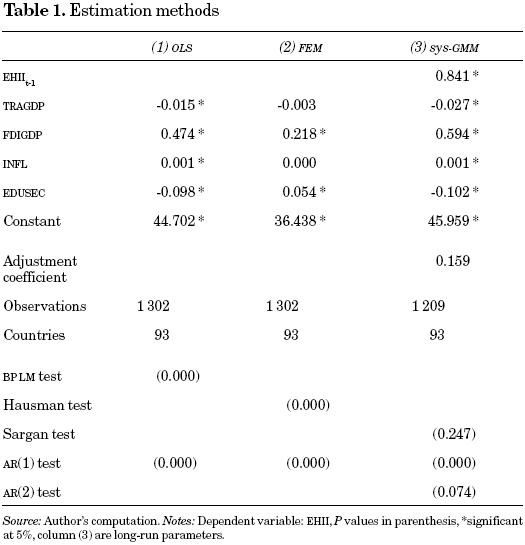 That is, there is no correlation between lagged differences of EHIIit and the country-specific effects. The method therefore uses lagged differences of EHIIit (the endogenous variable) as instruments for equations in levels, in addition to lagged levels of EHIIit as instruments for equations in first differences. The extended sys-GMM encompasses a regression equation in both differences and levels, each one with its specific set of instrumental variables. This type of estimation, called system estimator, not only improves precision and efficiency but also reduces finite sample bias.