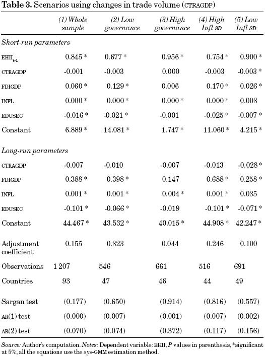 In summary, changes in trade volume do not have a significant relationship with income distribution in the overall sample, and, of the four sub-samples, only those countries associated with macroeconomic stability can obtain benefits from the expansion of trade, as table 3 illustrates. in addition, trade volume does not have a significant impact on countries that exhibit domestic inefficiency, but it improves income distribution in the remaining scenarios in table 2. Therefore, there is statistical evidence, emerging from the two variables on trade, which illustrates that countries with domestic efficiency are more likely to improve income distribution on account of an upturn in trade.