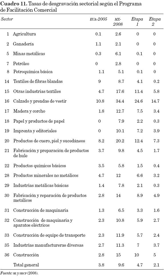 Como aplicación de la nueva versión del modelo intersectorial dinámico se consideró la iniciativa del gobierno denominada "Programa de Facilitación Comercial: Una Reforma Estructural" (SE y SHCP, 2008), cuyo fundamento es que el proceso de inserción del país en la economía mundial se inició con una apertura unilateral (a todos los países), para posteriormente continuar con la firma de tratados de libre comercio. Sin embargo, el agotamiento de los plazos de transición de reducción de aranceles de los tratados generó, por un lado, un escenario de apertura plena con los países con los que tenemos tratados, y, por otro, una alta protección comercial con los países con los que no tenemos tratados, siendo estos últimos proveedores más eficientes de un amplio número de insumos industriales y de bienes finales.