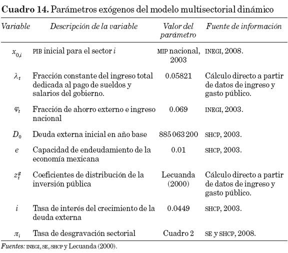 En nuestro caso, el escenario de referencia o central representa el mejor ajuste a la evolución observada de las principales variables durante el periodo 2003-2004. En ese sentido, se establecieron los parámetros exógenos del modelo como se muestra en el cuadro 14, y se calibraron los principales agregados económicos: producción, empleo, importaciones, etcétera.