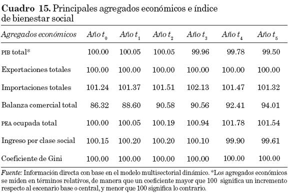 El escenario resultante de la desgravación arancelaria para cada año del periodo de simulación puede comparase con el escenario de referencia para la medición de los impactos del programa. Del cuadro 15 es evidente que los agregados de producción, exportaciones, ingresos y el coeficiente de Gini se mantienen con un coeficiente de 100 o prácticamente sin cambios respecto a los del escenario base. Mientras que los agregados que se modifican son la balanza comercial, las importaciones y los empleos. En particular, la balanza comercial es menos superavitaria que en el escenario de referencia, aunque mejora ligeramente a lo largo del tiempo; las importaciones presentan una evolución negativa durante todo el periodo y los ocupados exhiben una evolución positiva.
