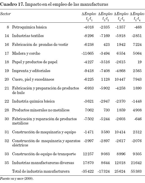 En cuanto al empleo manufacturero derivado de la reducción arancelaria de productos industriales, el nivel inicial de ocupados totales muestra una caída de -35 422 al inicio y -17 324 en el segundo periodo, aunque el número de ocupados se incrementó en 25 624 en el tercer periodo y en 55 383 en el cuarto. De forma sectorial, la mayoría de los sectores manufactureros disminuyen el empleo al inicio (resaltan las caídas bruscas de industrias textiles, madera y corcho, imprenta y editoriales, productos metálicos, productos de hule, cuero, piel y sucedáneos), y sólo en unas cuantas ramas aumenta (construcción de equipo de transporte, minerales no metálicos e industrias de manufacturas diversas).