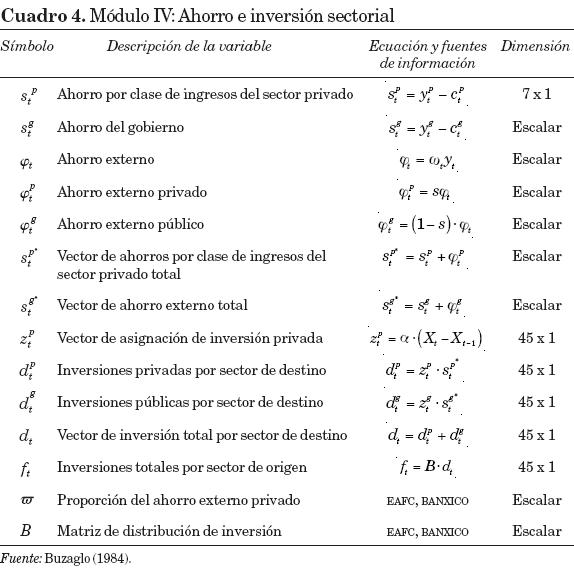 El bloque del ahorro e inversión determina el crecimiento balanceado. Se asume que la parte del ingreso que no se consume se ahorra. Se incluye el ahorro externo determinado por el ingreso nacional, distribuido entre privado y público. El ahorro total se convierte en inversión sectorial que se asigna a través de parámetros de política y rentabilidad privada. Esta inversión, a su vez, será la generadora del crecimiento de la producción sectorial para el siguiente periodo.