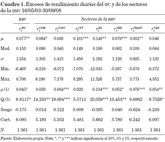 El resto del cuadro 1 muestra la estadística descriptiva para los excesos de rendimiento de los sectores de la BMV. Durante el periodo de estudio los sectores con mayores excesos de rendimiento diario fueron EX y CYT, con 0.148 por ciento y 0.101 por ciento, respectivamente; muy por arriba del IPC. Por su parte, VAR y CONS fueron los que tuvieron el peor desempeño, pues el promedio diario de sus excesos de rendimiento, aunque positivo, es estadísticamente no significativo. Todas las series presentan fuerte leptocurtosis.