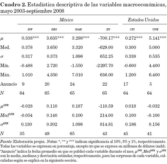 El cuadro 2 muestra la estadística descriptiva de las variables macroeconómicas mencionadas. Se observa que la serie INF sugiere una inflación anualizada promedio de 4.01 por ciento entre mayo de 2003 y septiembre de 2008, comparada con 3.26 por ciento para la economía estadounidense de acuerdo con la serie CPI, lo cual explica, en cierta forma, la diferencia en las tasas de desempleo promedio entre ambos países, 3.64 por ciento contra 5.14 por ciento. Además, se observa que la variable más difícil de predecir por el mercado es la relacionada con la actividad económica. Cada día que se publicó el IGAE la diferencia respecto a lo que esperaba el consenso fue mayor a cinco puntos base. Finalmente, durante el periodo de estudio México registro un déficit mensual promedio de 700 mdd en la balanza comercial.