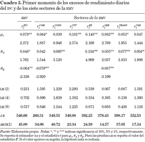 Como paso previo a la estimación del modelo (1)-(3) se procede a diagnosticar la presencia de efectos GARCH. Para ello se caracteriza el primer momento de los excesos de rendimiento a través de la determinación del mejor modelo ARIMA y asegurando que los residuales de éste no presenten ningún patrón de autocorrelación. Este paso es importante para así evitar que puedan aparecer efectos GARCH debido a problemas de especificación de la ecuación de media condicional. Al seguir la metodología convencional utilizada en econometría financiera se aplican tres pruebas (véase Aslam, 2005) sobre los residuales de la ecuación de exceso de rendimiento, ecuación (1), estimada por mínimos cuadrados ordinarios (OLS, por sus siglas en inglés). Específicamente, la prueba del multiplicador de Lagrange (LM, por sus siglas en inglés) para correlación serial a 2, 4 y 8 rezagos, la prueba de normalidad de Jarque-Bera y la prueba LM por efectos ARCH de Engle (1982) con dos rezagos. Esto se hace para los rendimientos diarios del IPC y de los siete sectores de la BMV. El cuadro 3 reporta los resultados.20