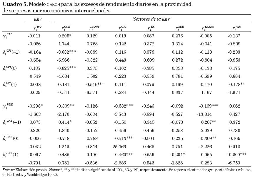 Dos regularidades interesantes que se observan en el cuadro 4 son que la volatilidad tiende a reaccionar previo a la publicación de las variables económicas, generalmente de forma descendente (δim (1)< 0), y que el desempleo impacta en el primer momento de las series de excesos de rendimiento de manera positiva (YiDES> 0). Es decir, se encuentra evidencia de que la volatilidad en el mercado accionario mexicano disminuye previo a la publicación de las variables económicas, como sucede en los mercados estadounidenses (Brenner et al., 2009), y que el mercado mexicano compensa por el riesgo de un mayor desempleo al esperado.