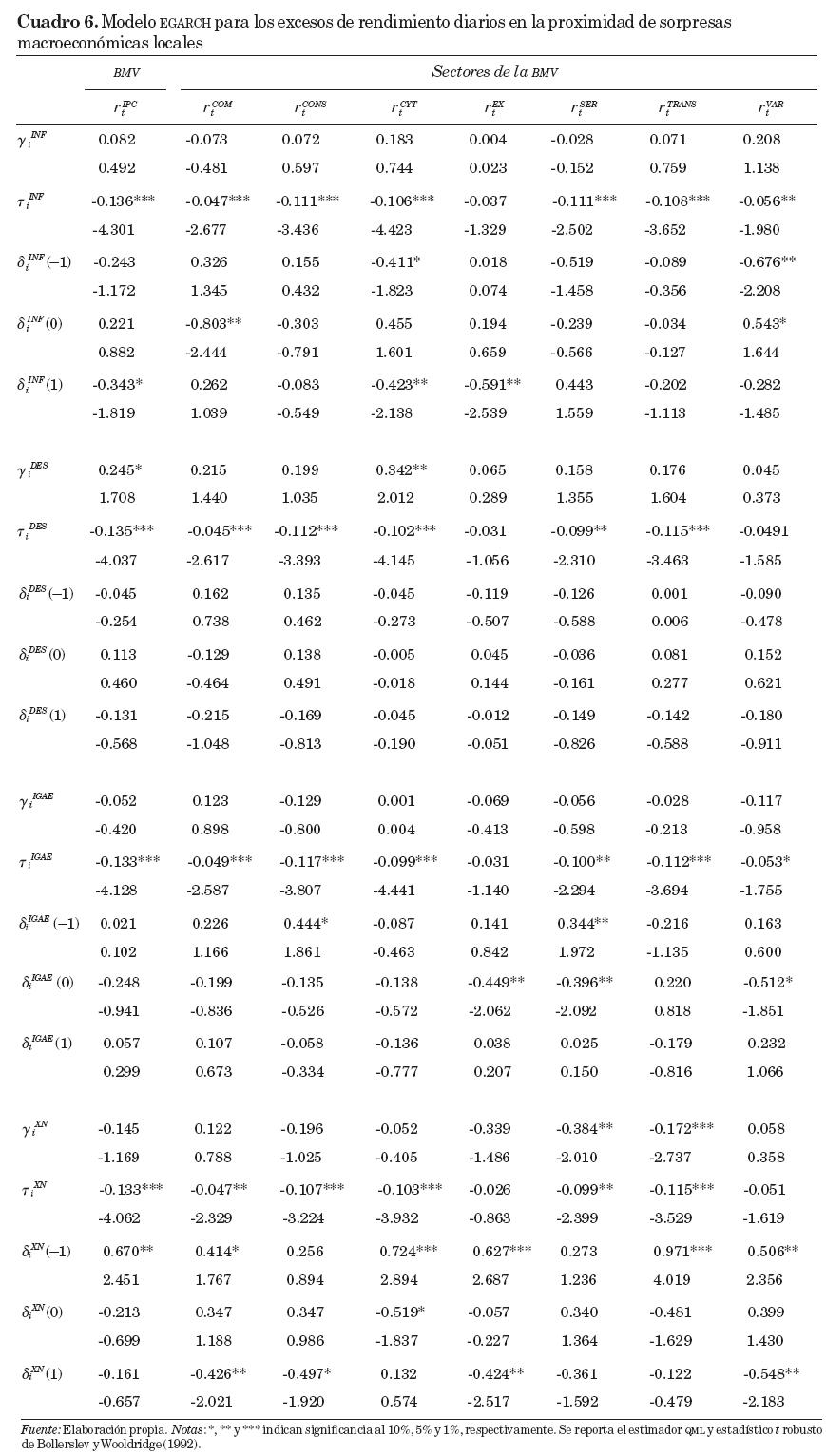 Por otro lado, se encuentra que las sorpresas con mayor influencia en el mercado accionario son las de inflación y las de exportaciones netas. Sin embargo, a diferencia de otros estudios, como De La Calle (1991), la inflación no impacta en el primer momento de la serie, sino en la volatilidad.23 Por otro lado, aunque López y Vázquez (2002) y López (2006) consideran, en principio, importante la información sobre el comercio internacional, estadísticamente24 encuentran que no genera influencia significativa en los rendimientos accionarios. Sin embargo, el cuadro 4 muestra evidencia de que las exportaciones netas representan un factor importante en la dinámica de los excesos de rendimiento. La diferencia puede radicar en que nuestro análisis utiliza datos diarios (no mensuales) y se enfoca en el impacto que genera la publicación de estas variables.
