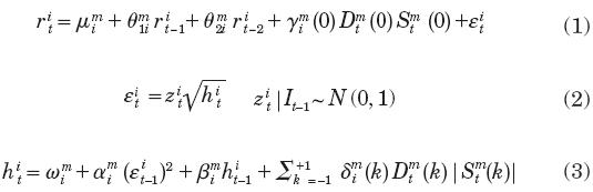 La especificación en (1)-(3) es una modificación del modelo de Brenner et al. (2009), la cual permite que las sorpresas de la variable macroeconómica m impacten los primeros y segundos momentos de la distribución condicional del exceso de rendimientos. A diferencia de Brenner et al. (2009), la ecuación (3) únicamente captura el efecto de las sorpresas macroeconómicas sobre el coeficiente de intercepto de la varianza condicional. Una formulación más general podría incluir el nivel total de la varianza. El coeficiente Yim (0) captura el impacto promedio de la sorpresa estandarizada Stm en la media de los excesos de rendimiento en la fecha en que se da el anuncio. Incluir Stm (k) en lugar de |Stm (k)| en (3) puede disminuir el impacto en hti, dado que el solo hecho de que se den sorpresas económicas afecta la volatilidad condicional (Jones et al., 1998; Brenner et al., 2006). Los coeficientes δim (k) aproximan el impacto secuencial de sorpresas macroeconómicas estandarizadas absolutas sobre la varianza condicional (Brenner et al., 2009). Asi, δim (1) se puede interpretar como una medida de anticipación, δim (0) como un efecto contemporáneo y δim (-1) como una medida de persistencia. De esta manera, estos coeficientes capturan los cambios en el nivel de la volatilidad condicional antes, durante y después de la ocurrencia de las sorpresas macroeconómicas |Stm (k)|. Esta es una forma de modelar los diferentes enfoques para explicar cambios en precios discutidos en la segunda sección.