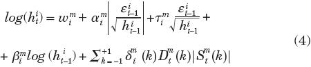 si Dtm (k) = 1 y cero en otro caso. Dado que zti es un proceso de ruido blanco (media cero y varianza uno) distribuido normalmente, εti se distribuye normal con media cero y varianza hti condicional a It-1, es decir, εti | It-1~N (0, hti). Finalmente, se imponen las restricciones