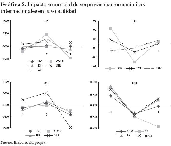 ; la volatilidad del mercado generalmente tiende a disminuir (δim (1) < 0) previo a la publicación de las variables macroeconómicas, y las sorpresas con mayor influencia en el mercado accionario son las de inflación y las de exportaciones netas.