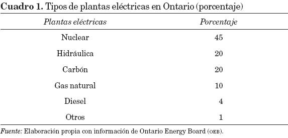 Ontario es la provincia más poblada de Canadá; aproximadamente 12 millones de personas viven en ella, dentro de un área de 1 076 395 km2. Las principales fuentes de energía que existen en esta provincia son la nuclear, la hidráulica y la termal. La distribución porcentual aproximada de las fuentes de energía que existen en Ontario se muestra en el cuadro 1.