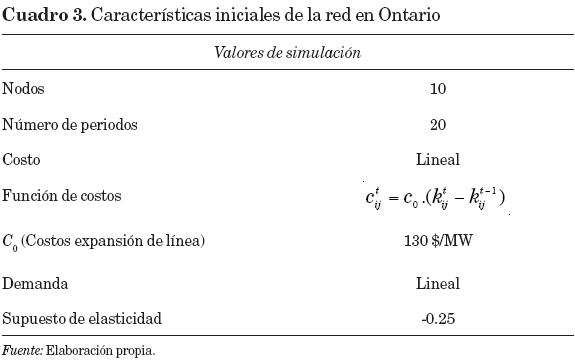 En el cuadro 3 se muestran las características iniciales de la red asumidas para la simulación. El número de nodos agregados es diez; consideramos 20 periodos como horizonte de corridas del modelo, aunque la convergencia pudiera darse en un número menor de periodos. La función de costos es lineal, tal como se expresa en el cuadro 3. Asumimos un costo de expansión que asciende a $130 por MW. La función de demanda es lineal y suponemos una elasticidad-precio de la demanda de -0.25. Así, los datos de demanda son los valores iniciales de la función de demanda, y la elasticidad nos sirve para construir la función de demanda para los siguientes periodos de simulación. Por otra parte, los valores de referencia para las simulaciones del modelo son aquellas variables básicas que caracterizan la red eléctrica de Ontario y que se muestran en el cuadro 4.
