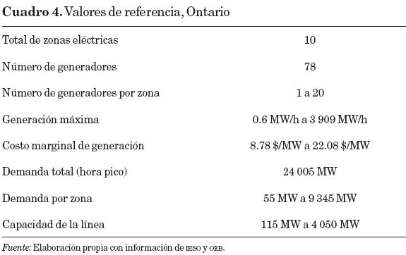 Los datos utilizados para este estudio se obtuvieron de fuentes de información secundaria de organizaciones públicas, como son el operador del sistema (IESO, 2011) y el regulador en la provincia de Ontario (OEB, 2011b), publicadas en sus respectivas páginas Web. Luego, realizamos una recolección y sistematización de esos datos y creamos nuestra propia base de datos, que consiste en zonas eléctricas (cuadro 2), nodos (cuadro 2), nombre de generadores y sus tipos de tecnología, generación máxima en cada nodo, demanda para el año 2009, costos de generación y precios de oportunidad (apéndice 1), y capacidad de 11 líneas de transmisión.