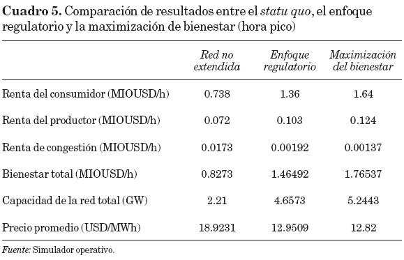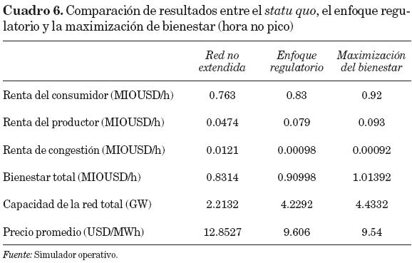 En los cuadros 5 y 6 hacemos la comparación para escenarios de demanda pico y no pico, respectivamente. En hora pico el bienestar del consumidor y del productor aumentan significativamente con la aplicación del enfoque regulatorio; crecen en 84 y 43 por ciento respecto a la situación inicial. Así, el bienestar social asciende 77 por ciento después del tratamiento regulatorio de las redes. Además, se observa que los niveles de bienestar del consumidor, del productor y el social convergen al óptimo de bienestar obtenido en el modelo de ISO benevolente. Otro resultado importante es el aumento significativo de la capacidad total de la red. De acuerdo con los resultados de nuestro modelo, la red tendría que expandirse prácticamente al doble de su situación inicial para disminuir congestión y balancear el sistema, y este efecto se refleja en la disminución de la renta de congestión (88%).