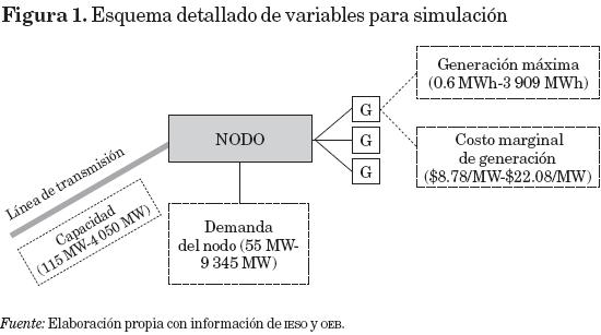 Además, en la figura 1 se detalla el esquema de las variables necesarias y sus valores concretos para la simulación. Cada nodo tiene asociados su máxima capacidad de generación, una demanda referente, el costo de generación por MW, así como la capacidad de la línea de transmisión que lo conecta con otros nodos.