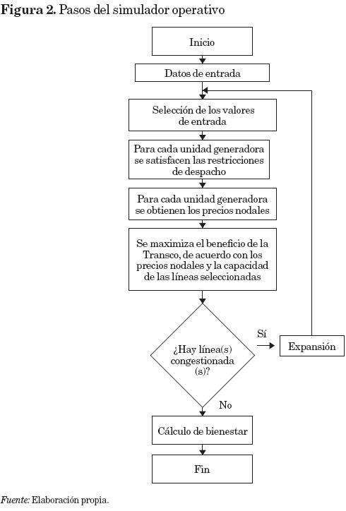 Para las corridas del modelo se construyó un simulador.11 Los pasos del simulador se abrevian en la figura 2, donde se describe el algoritmo utilizado para resolver el modelo detallado anteriormente. En este algoritmo se resuelven, en primera instancia, las ecuaciones para el ISO (restricciones físicas de la red) y posteriormente para la Transco (restricción de precio máximo). El mecanismo aplicado para la simulación toma los precios nodales iniciales arbitrarios, y promueve su convergencia hacia un precio de equilibrio con una menor renta de congestión y un mayor bienestar social. El tiempo de convergencia para nuestros datos fue de siete periodos, tanto en las horas de alta como en las de baja demanda eléctrica. El proceso culmina cuando los precios nodales ya no varían a lo largo del tiempo y los cambios en la capacidad de las líneas de transmisión son muy pequeños. Así, el incremento de la capacidad de transmisión permite que fluya energía de bajo costo a las zonas con alta demanda y con generación de energía más cara.