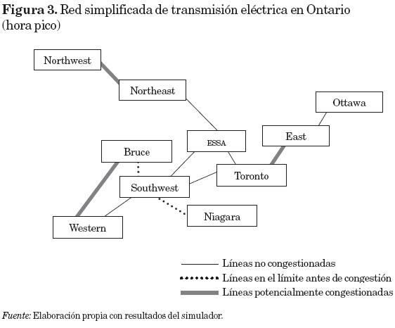 Los problemas de congestión potencial, en un escenario de hora pico, se presentan entre los nodos de Northwest-Northeast, Toronto-East, y Bruce-West. En la figura 3 las líneas continuas más gruesas son las redes congestionadas. Cabe precisar que después de la corrida del modelo, muchas otras líneas alcanzan su máxima capacidad (líneas punteadas en la figura 3). Éstos son los casos de los nodos Bruce-Southwest y Southwest-Niagara. En un escenario de hora no pico también se detectaron líneas con congestión, aunque no tan pronunciada. Los nodos Northwest-Northeast, Toronto-East, Bruce-Southwest, y Southwest-Niagara son los que resultan congestionados (véase la figura 4).