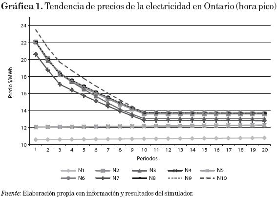 El mecanismo aplicado para la simulación toma los precios nodales arbitrarios y promueve su convergencia hacia un precio de equilibrio con menor renta de congestión y mayor bienestar social. Así, el incremento de la capacidad de transmisión permite que fluya energía de bajo costo a las zonas con alta demanda y con generación de energía más cara. Por tal razón, el mecanismo se aplica a zonas congestionadas y de demanda creciente, como la provincia de Ontario, en donde no existen mecanismos eficientes que promuevan una adecuada expansión de las líneas de transmisión, y, más aún, donde los mecanismos de determinación de precios de la electricidad tienen poco que ver con elementos de mercado.