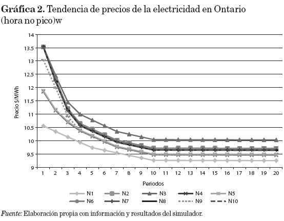 La gráfica 1 muestra la convergencia durante 20 periodos de los precios iniciales hacia un precio óptimo en un escenario de hora pico. En el primer periodo los precios nodales difieren sustancialmente debido a que algunas líneas están sujetas a altos niveles de congestión. Con excepción de los nodos 1 y 5, correspondientes a Northwest y East, respectivamente, todos los demás nodos empiezan con altos precios nodales (casi $25/ MWh). En el primer periodo el precio más bajo corresponde al nodo Northwest ($10.57/MWh), mientras que el más alto está en West ($23.53/ MWh), y el promedio de precios nodales para el primer periodo es de $18.92/MWh. Sin embargo, ocurre una rápida convergencia de precios nodales que llega a su óptimo en el periodo 7. El precio promedio después de los primeros siete periodos es de $12.95/MWh, equivalente a 31.56 por ciento más bajo comparado con el promedio de precios nodales con que se inició la simulación.