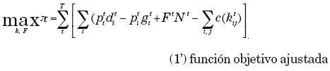 En el nivel alto la Transco busca maximizar sus beneficios, dada la restricción de precio tope. La función objetivo de la Transco es igual a la sumatoria de los ingresos por subasta de FTR (pagos variables) más los ingresos por transmisión (pago fijo) menos los costos por expandir la red.