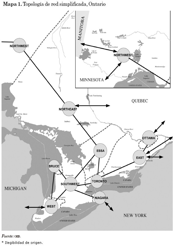 La topología de la red simplificada sobre la cual se corrió el modelo se muestra en el mapa 1. Resulta de la agregación de nodos, líneas y demandas en las zonas eléctricas de Ontario para conformar diez grandes nodos o hubs (véase el cuadro 2).