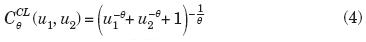 where θ ∈ [1, ∞). When θ = 1 describes the independence copula, while for θ → ∞ it describes the comonotonicity copula. The bivariate Clayton copula is given by: