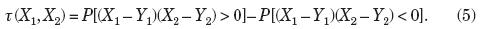 The main element of association in this study is the Kendall tau. It is a measure of concordance between two random variables. Two points (x1, x2), (y1, y2) are said to be concordant if (x1 -y1)(x2 -y2) > 0, and discordant if (x1 - y1)(x2 - y2)<0. In a similar way, two-random vectors (X1, X2), (Y1, Y2) are said to be concordant if P[(X1 - Y1)(X2 - Y2) > 0] is greater than P[(X1 -Y1)(X2 - Y2) < 0], that is, if X1 tends to increase with X2, and discordant the other way. The Kendall tau measures these differences in probability