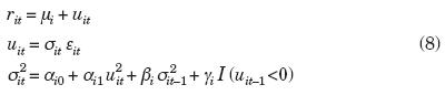 The model used is a TGARCH (1,1) for the returns of the index of the country i: