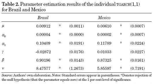 Estimation results of the individual TGARCH(1,1) model (8) for each country is presented in table 2 for the entire sample. This estimation was used as an initial condition for the copula estimation with (9).