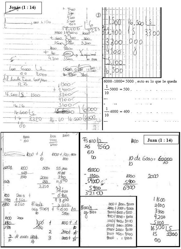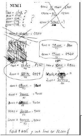 Los sujetos de este nivel ya no piensan que el total de dinero para repartir se relaciona con la suma de los números 1000, 2000 y 3000 porque se mencionan en el enunciado; ellos comienzan con cualquier número. De forma paralela a una mejor competencia numérica, los estudiantes cuestionan su propia forma numérica de resolver y aspiran a utilizar fórmulas o ecuaciones, a las que califican como más matemáticas. Se advierte una mejora que podría relacionarse con una evolución del sistema cognitivo en general, vinculada con la escolarización.