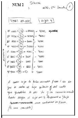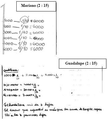 Las estrategias utilizadas por los sujetos de Segundo Año son similares a las que acabamos de describir para Primer Año, aunque parece que ellos dependen menos de los valores numéricos mencionados en el enunciado. Las entrevistas indican que están preocupados por comprender porqué todos los hijos reciben lo mismo, ya que desde su concepción la manera en que se constituyen los montos asignados es incapaz de garantizar la igualdad del reparto. Por ejemplo, insisten en señalar que, si bien el enunciado habla de tres hijos, en realidad son más; adoptan una actitud más reflexiva que interfiere en sus intentos de solución, lo cual genera protocolos con poco nivel de claridad.