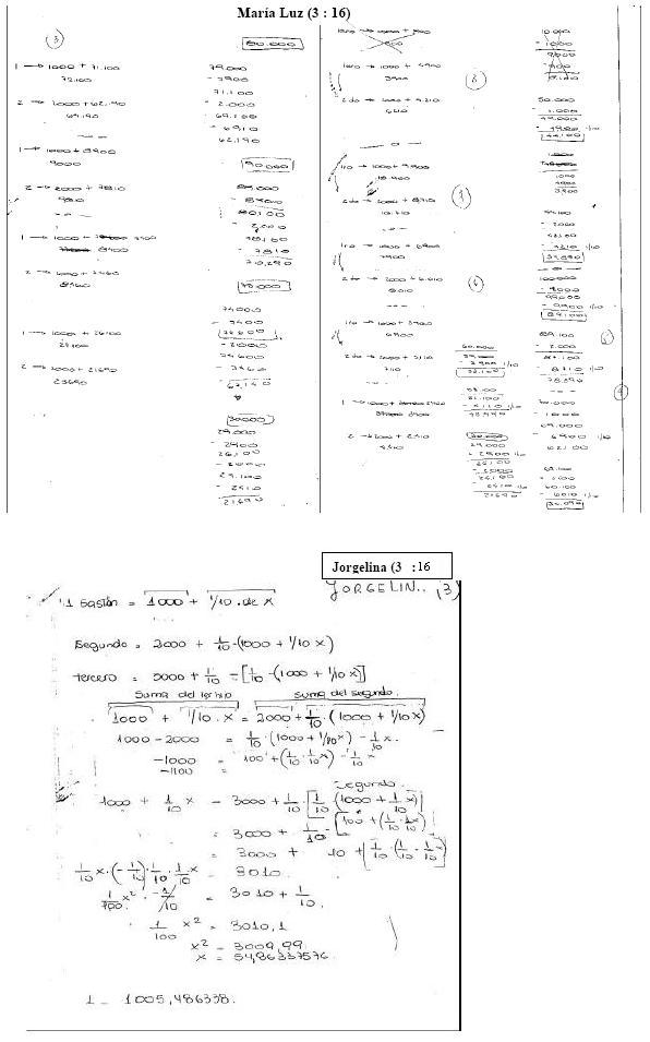 A continuación se presenta el caso de Jorgelina (3 : 16), quien intentó una solución relacionada con el álgebra escolar. Como se advierte en el protocolo escrito, la entrevista demostró que ella no comprendió adecuadamente cómo se calculaban los montos de los hijos porque verbalizó y escribió incorrectamente las operaciones. Respecto a las características de su resolución, se observa que Jorgelina buscó expresar algebraicamente las operaciones indicadas en el enunciado, haciendo una Resolución Algebraica Típica (RAT), que describimos en el tercer apartado. Dicha forma de resolver corresponde a las características del álgebra escolar concebida como una aritmética generalizada (Bolea, Bosch y Gascón, 2001). Las técnicas basadas en actividades de traducción literal se sustentan en una concepción que presenta al álgebra escolar como un "lenguaje algebraico" y al aprendizaje del álgebra como una adquisición de técnicas de traducción. Esos procedimientos se encuentran tanto en los textos escolares (Otero, Elichiribehety y Roa, 2001) como en las prácticas docentes habituales.