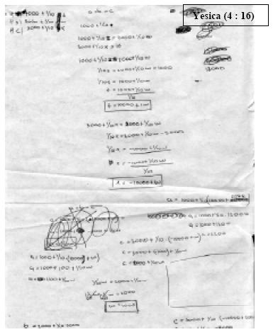 El caso de Yesica (4 : 16), que puede apreciarse en el protocolo siguiente, es muy interesante porque escribe expresiones para tres hijos (a los que designa como a, b, c) y considera tres incógnitas para los restos (z, w, x). Tal solución es similar a la que en el tercer apartado denominamos como Resolución Algebraica formulando más de dos Hijos (RAH). A partir de su exploración, Yesica llega a la conclusión de que la diferencia entre dos restos sucesivos es diez mil pesos, mas no puede utilizar este resultado, ya que no planteó ningún resto en función a la cantidad total de dinero.