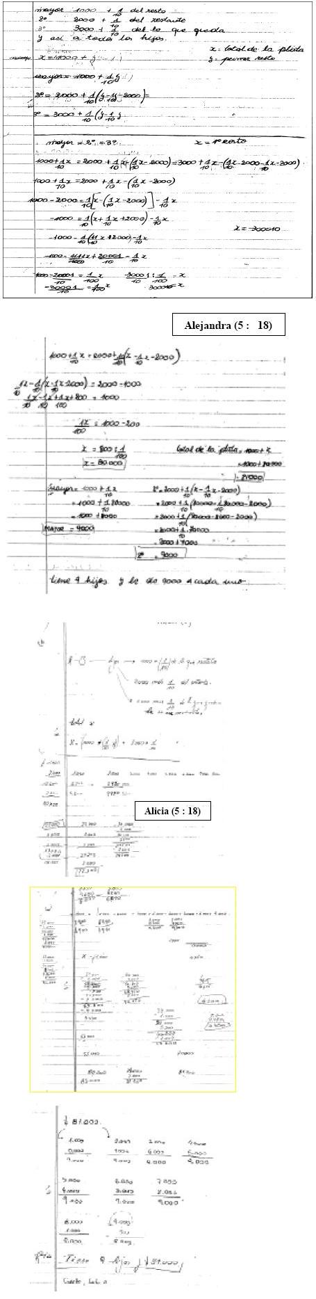 El mejor desempeño de los sujetos de Quinto Año cuando resuelven el problema se debería al número de relaciones que pueden manejar, a la eficiencia con que pueden operar y a su capacidad de efectuar relaciones adicionales para la validación del resultado. El caso de Alejandra (5 : 18) permite apreciar un proceso que comienza con una exploración algebraica y finaliza con una resolución algebraica correcta, muy diferente a los procedimientos que se basan en traducir las operaciones expresadas en el enunciado.