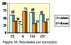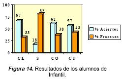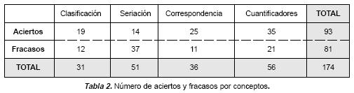 En este apartado, analizamos las respuestas de los 13 alumnos a las actividades sobre los conceptos lógicos que planteaba el tutorial inteligente. La Tabla 2 contiene los éxitos y fracasos de las 174 actividades; de éstas, 31corresponden a clasificación (CL), 51 a seriación (S), 36 a correspondencia uno a uno (CO) y 56 a cuantificadores (CU). El número es diferente para cada concepto porque el tutorial muestra a los alumnos las actividades en función de sus respuestas, aunque el análisis de los resultados se hará en forma global.