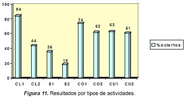 Como dijimos en el apartado anterior, se plantearon dos tipos de actividades para cada uno de los conceptos lógicos. En la Tabla 3 y la Figura 11 aparecen los resultados, teniendo en cuenta el tipo de actividad.