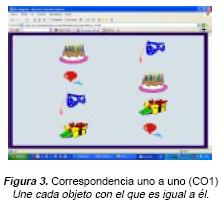 Los dos tipos de actividades tocantes a la correspondencia uno a uno se diferencian en la relación entre los objetos: las de CO1 implican la igualdad, mientras que en las de CO2 los objetos no son exactamente iguales; éstas presentaron mayor dificultad para los alumnos (62% de aciertos, frente al 74% en las de CO1). Como vimos en los ejercicios de clasificación, hallar relaciones lógicas de un orden superior, donde no hay una igualdad explícita entre los objetos, se torna más complejo para los alumnos.
