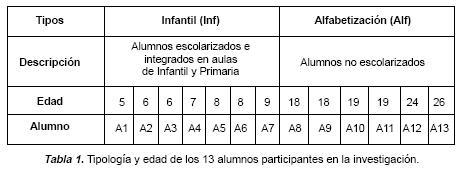 En la Tabla 1 se muestra la información detallada sobre los alumnos, cuyas edades oscilan entre los 5 y 26 años. De los 13 alumnos participantes en esta investigación, siete de ellos están escolarizados e integrados en aulas de Infantil y Primaria, aunque siguen el currículo de Infantil, por lo que los denominamos alumnos de Infantil (Inf). A los otros seis los llamamos de Alfabetización (Alf), pues son alumnos no escolarizados que reciben en la ATT21 clases de formación académica en diferentes disciplinas; el conocimiento de matemáticas que se les imparte corresponde al currículo de Infantil. Los motivos por los que no están escolarizados son diversos: ya sea porque han abandonado los centros educativos a muy temprana edad, o porque han cumplido la edad de escolarización.